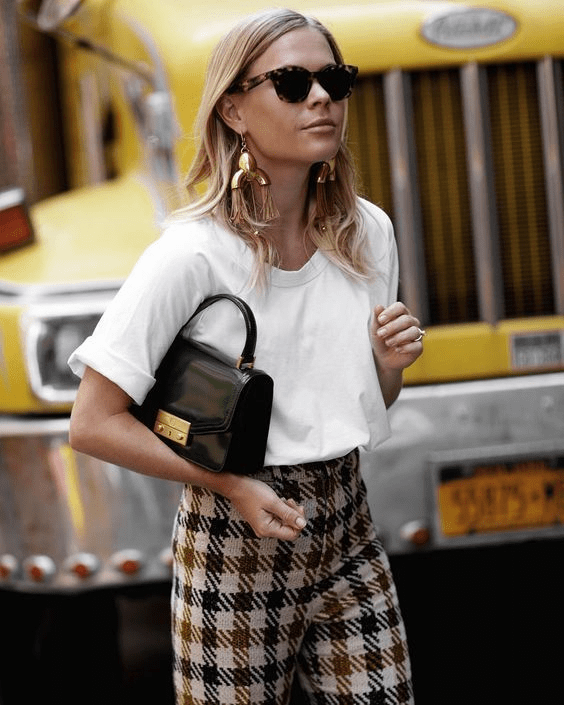You can have anything you want in life if you dress for it that is why we have put together this t-shirt outfit idea for you. Checkered pants aren’t just associated with blazers; they look super stunning with t-shirts as well. Upgrade the look with closed shoes and a small bag of different colors for a moody contrast.